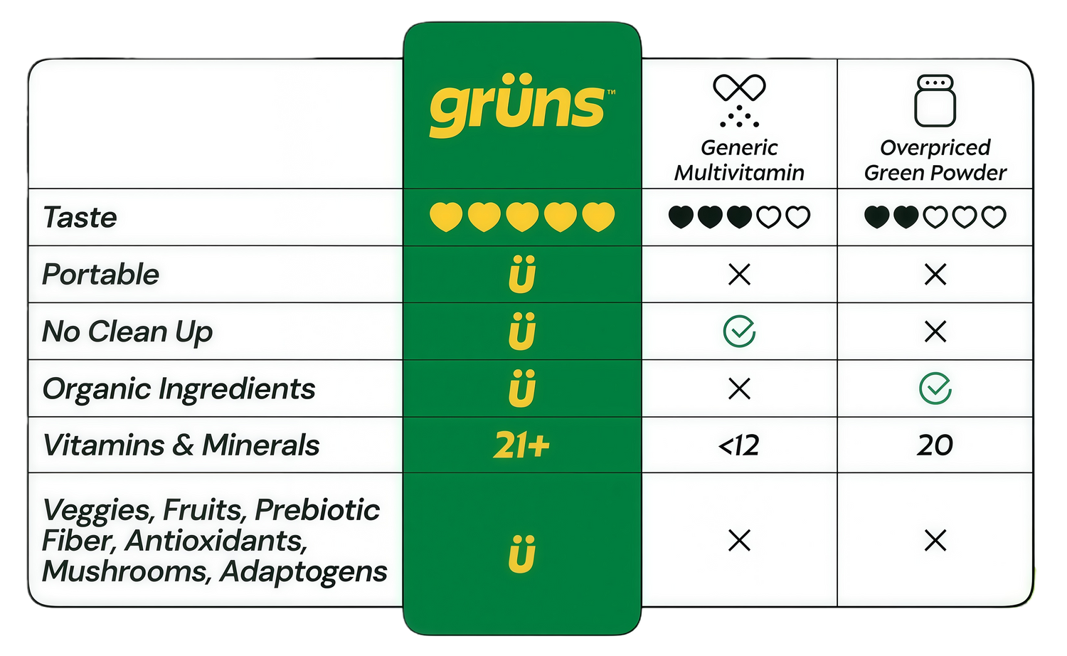 So we decided it was time to fix it. No more choking on and popping pills like a pharmacy. No more clean-up and disgust from gross powders. And no more cobbling together handfuls to dozens of supplements. Grüns is comprehensive nutrition, made convenient and delicious.